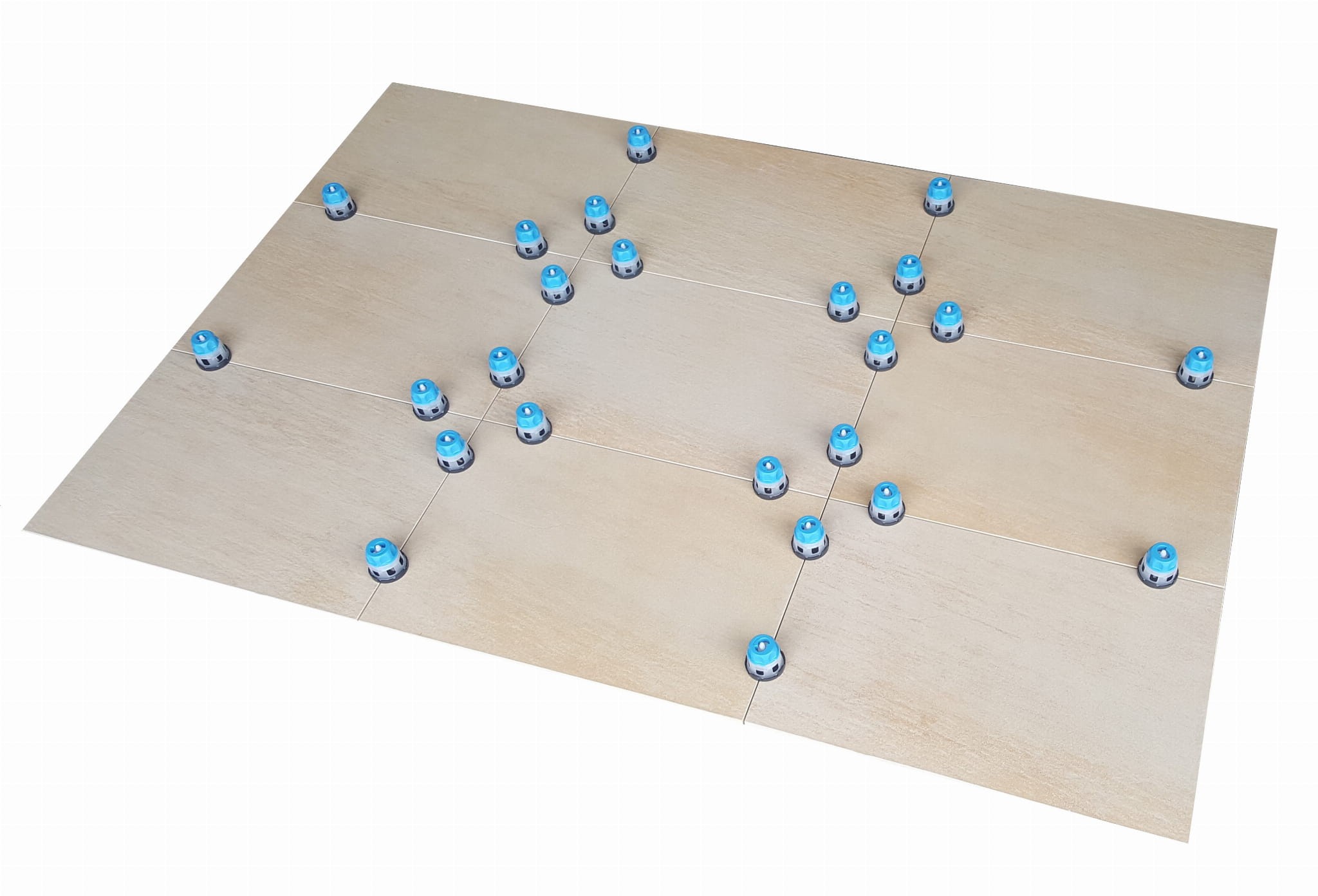 1. Rozprowadź klej i połóż pierwszą płytkę, wsuń podstawę wyrównującą pod płytkę i dosuń kolejną;