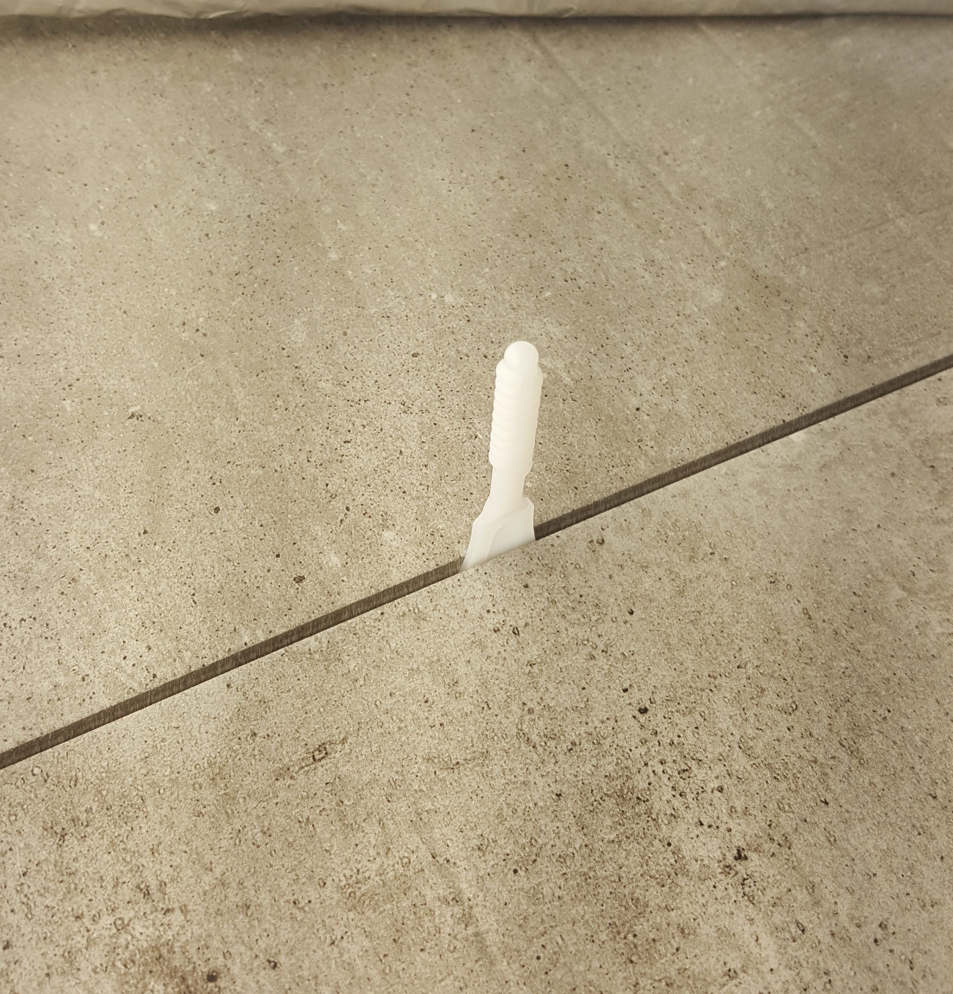 1. Rozprowadź klej i połóż pierwszą płytkę, wsuń podstawę wyrównującą pod płytkę i dosuń kolejną;
