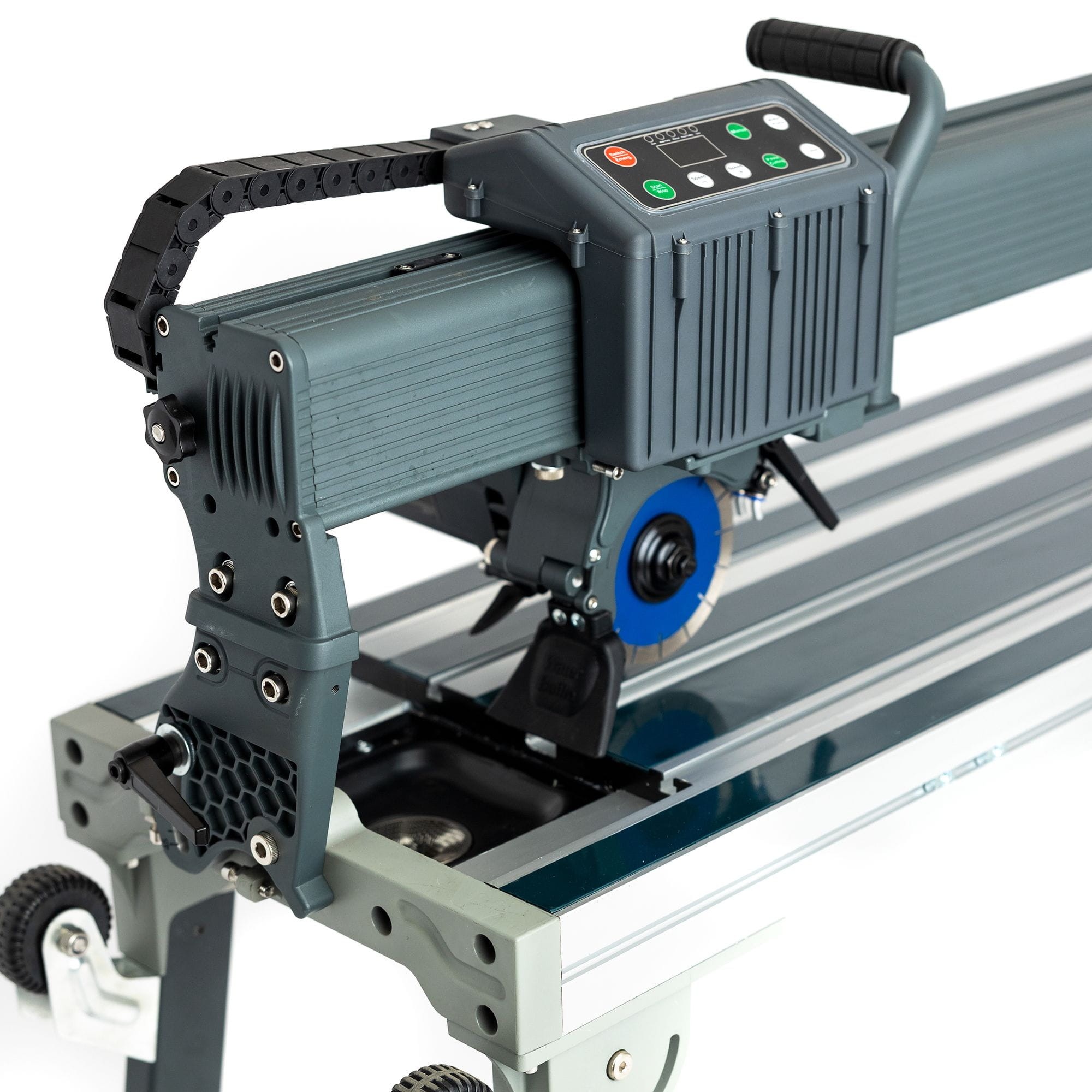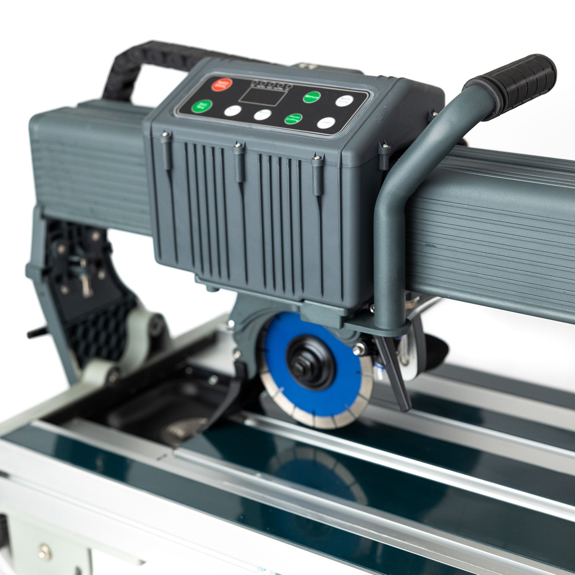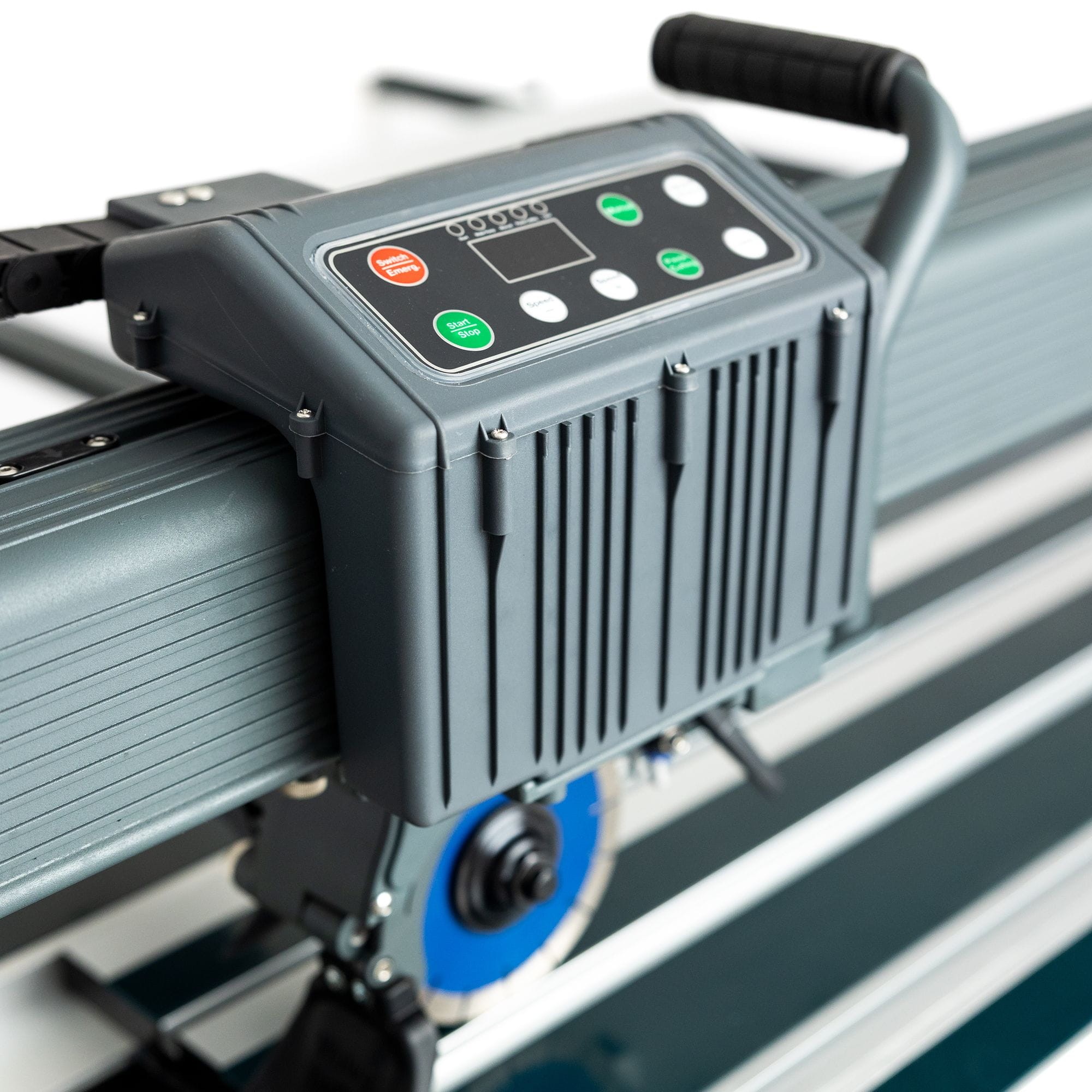Obsługa maszyny jest prosta i intuicyjna dzięki panelowi z wyświetlaczem, który umożliwia regulację trybów pracy, kontrolę dopływu wody, oświetlenie LED, laser oraz prędkość posuwu przecinarki. Dzięki 10 poziomom prędkości w trybie automatycznym, można łatwo dostosować pracę do konkretnych potrzeb i materiałów, co sprawia, że jest to idealne rozwiązanie dla profesjonalistów pracujących na tych samych płytkach i tarczach.