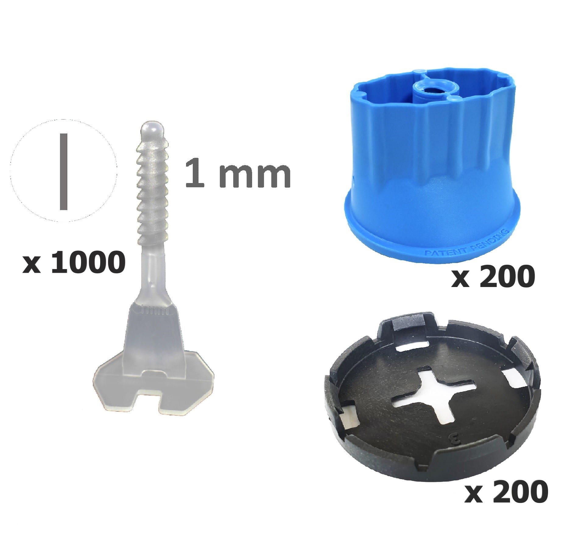 Zestaw składający się z 1000 podstaw prostych o szerokości 1mm oraz 200 głowic obrotowych (+200 podkładek) Twist Level wielokrotnego użytku.